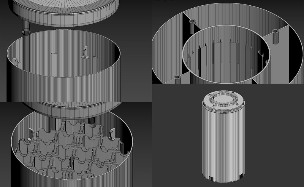 Poseben izziv so bile absorber plošče (Boral/Metamic) v košari. V realnosti so to tanki kompozitni elementi, sestavljeni iz aluminijeve matrice z borovim karbidom. Čeprav jih zunanji opazovalec nikoli ne vidi, imajo ključno vlogo: absorbirajo nevtrone in s tem zagotavljajo varnost sistema. V modelu sem jih zato poudarila kot ločen element, da postane njihov pomen očiten tudi ne-strokovnemu gledalcu. Še ena posebnost je bila razlika med zgornjim pokrovom in zunanjim valjem. Pokrov v resnici ni poravnan z obodom, ampak je rahlo vstavljen noter, tako da pokriva tudi ventilacijske jaške. Ta detajl sem želela vključiti, saj je bistven za razumevanje pasivnega hlajenja: zrak pride spodaj, se segreje ob MPC in izstopi pod pokrovom.