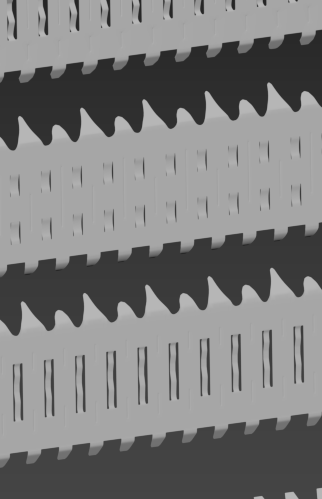 Trenutno testiram njihovo vertikalno razporeditev in debelino, saj vsaka mreža v sestavi opravlja drugačno funkcijo – od robustne spodnje “end grid” do sredinskih z mešalnimi lopaticami.