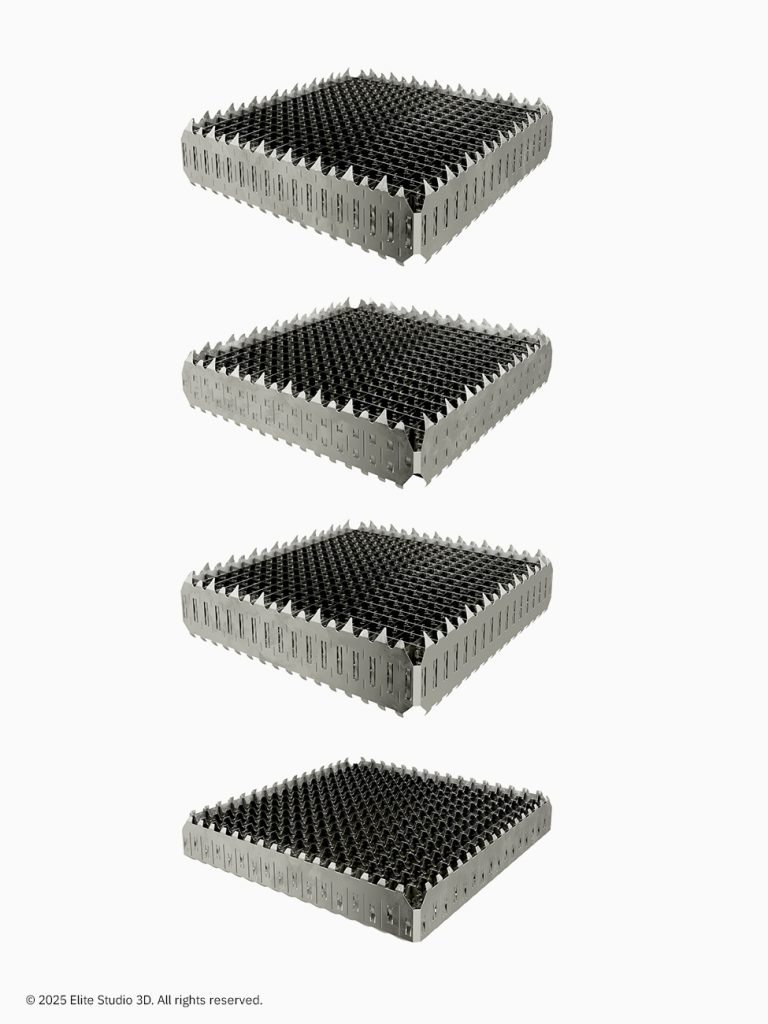V tej vizualizaciji sta springs in dimples modelirana natančno, v skladu z njihovo splošno znano strukturo. Ti elementi so ključni za mehansko stabilnost gorivnega elementa, saj zmanjšujejo tveganje vibracijskega frettinga in ohranjajo ponovljivo lego palic v vseh obratovalnih pogojih. Takšna zasnova je standardna v PWR gorivih in jo potrjujejo tudi javno dostopne tehnične referenčne dokumentacije ter patenti, ki opisujejo različne izvedbe anti-fretting vzmeti in kontaktnih površin (npr. patent US 7,835,484).