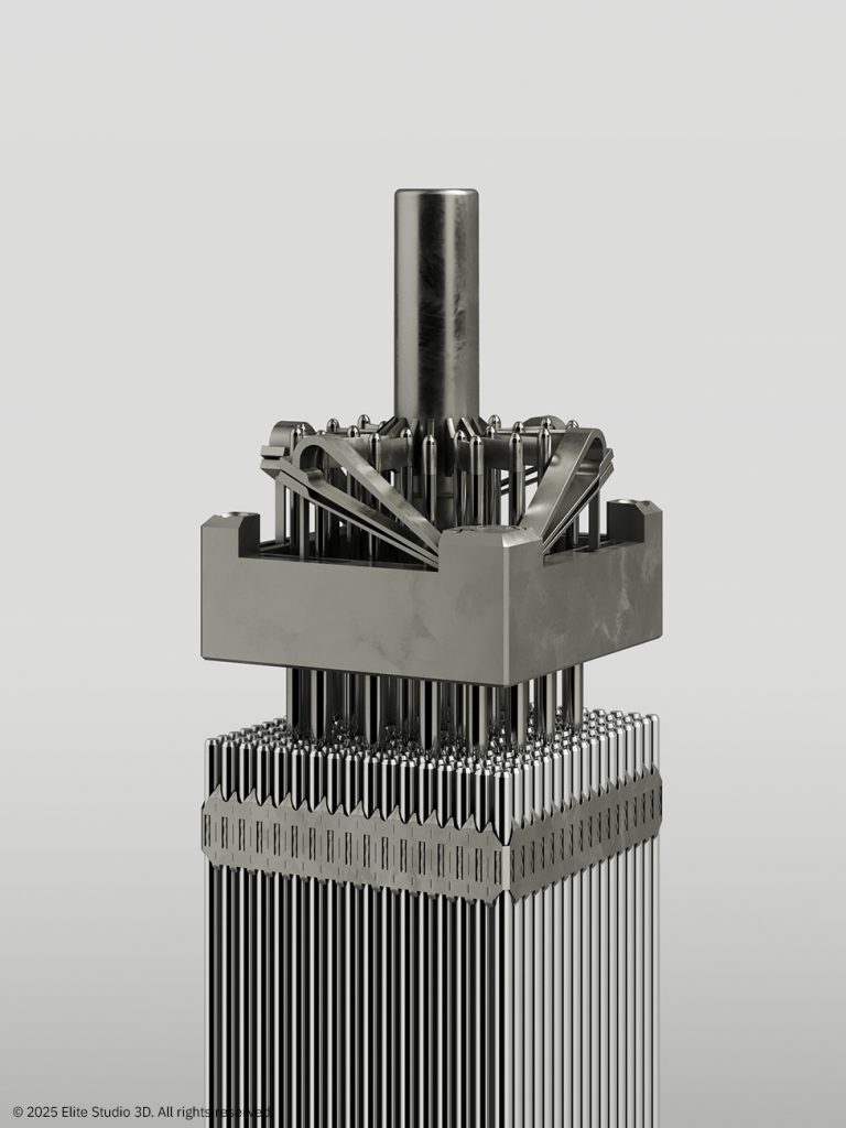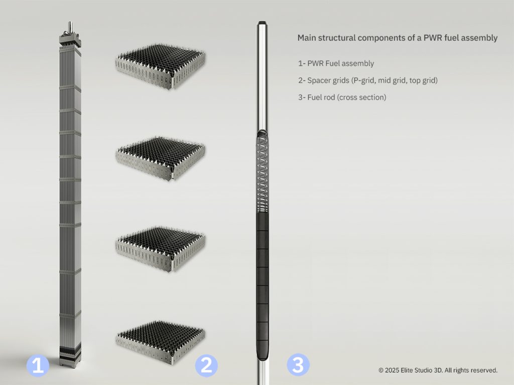 V jedrskih elektrarnah tipa PWR je gorivni element tisti del reaktorske sredice, ki v največji meri določa energijski izkoristek, nevtronsko ekonomijo in dolgoročno varnost obratovanja. Čeprav deluje kot standardiziran industrijski izdelek, je njegova notranja logika rezultat desetletij razvoja, optimizacij, materialnih študij in inženirskih kompromisov. Pravilno ga razumeti pomeni razumeti, zakaj so današnji lahkovodni reaktorji tako robustni, predvidljivi in učinkoviti. Namen tega prispevka je predstaviti osnovno arhitekturo PWR gorivnega elementa ter proces njegove natančne 3D-vizualizacije, ki združuje tehnično razumevanje, materialno znanost in vizualni minimalizem.